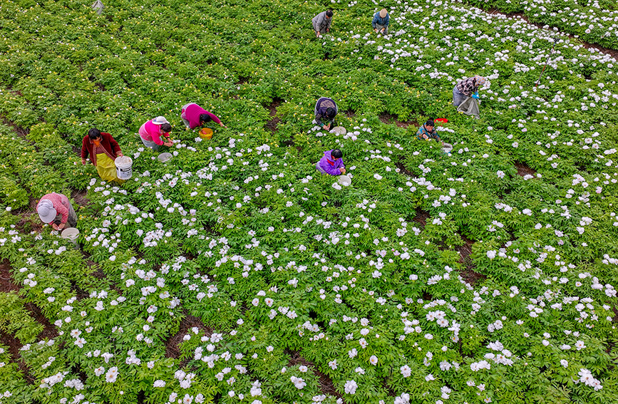 2026年4月11日,安徽亳州谯城区赵桥乡柯针园村中药材种植基地,农民正在采摘牡丹花瓣,准备烘干后供应花茶市场。近年来,谯城区立足本地资源,推广“公司+合作社+基地+农户”经营模式,大力发展牡丹、白芍、菊花等道地药材产业,构建种植、加工、销售一体的产业链,拓宽农民增收渠道,助力乡村振兴。