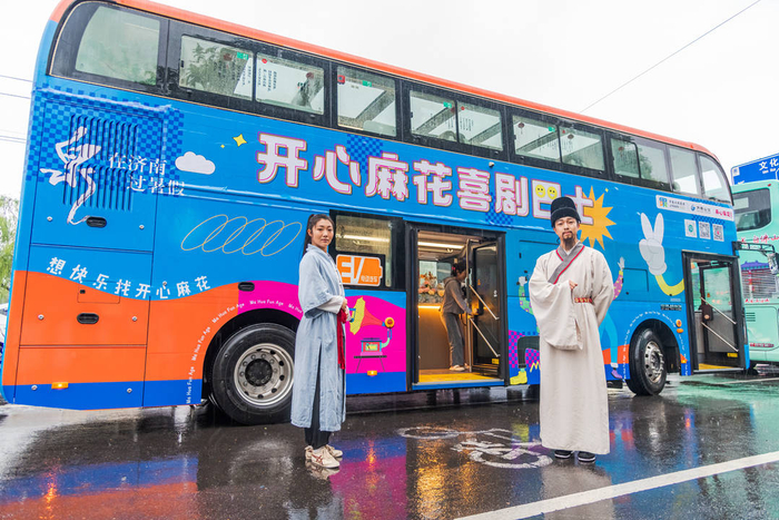 “今天北洋大戏院来了这么多朋友,我是老板,花名黑杰克!”2026年元旦,一声带着老济南腔调的神秘开场白,从一辆驶出泉城广场的双层巴士上层传来。一场为期半小时的沉浸式城市戏剧之旅,在车轮转动间拉开帷幕。这辆印着“这一站,济南!先生请上车!”的巴士,并非寻常观光车。它由济南人熟悉的777路泉水观光线路创意